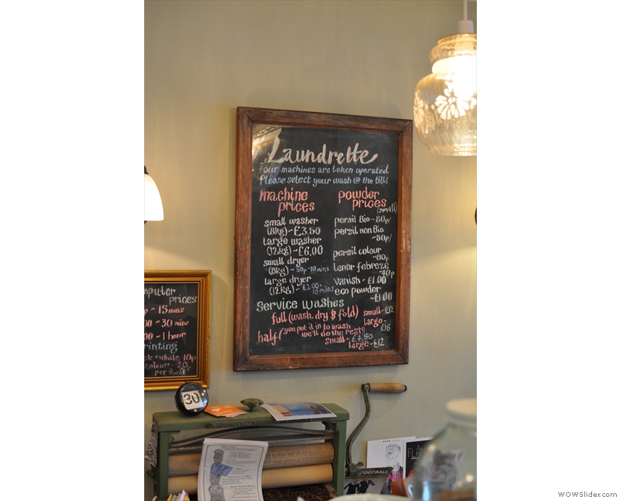 The seating is to the left and right, with a clear path through the middle to the counter, which is opposite a bank of washing machines (I did mention it was a laundrette, didn’t I?). An exposed, rough stone arch behind the seating on the right leads to a small area with the computers (I did mention it was an internet café, didn’t I?). The seating is an interesting mix with a long table with attached benches and a round four-person table on the right and four two-person tables on the left, with a carved wooden bench-seat against the wall. Beyond that there’s a very comfy-looking sofa, while the counter has a small bar.