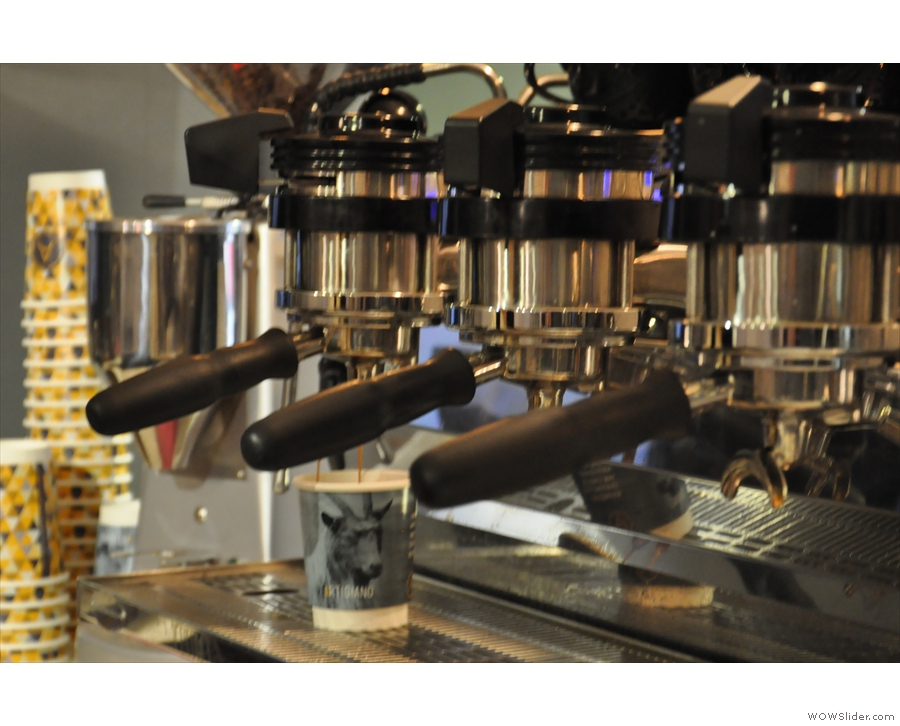 On my return, I kick-started my day with a piccolo and a very fine pain au chocolate. Artigiano had just switched to an exclusive house-blend from Origin, a mix of two Brazilian beans, one pulped and one naturally processed. It went very well with the milk in the piccolo, not getting lost as the decaf had. This prompted me to try it as a straight espresso, where I found it equally as good. It was sweet when first hitting the palate, but then gave way to a touch of bitterness which I really liked.