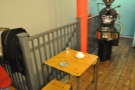 The bulk of the counter runs perpendicular to the window, along the centre line of the store, cake first, followed by till, then (ridiculously shiny) espresso machine. There are some small, round tables between counter and stairs, while the rest of the seating is beyond this point, where the store widens out. A bench lines the right-hand and back walls with a row of small, square tables, while another row of tables runs down the centre of the room, with a few tables between the back of the counter and the second staircase.