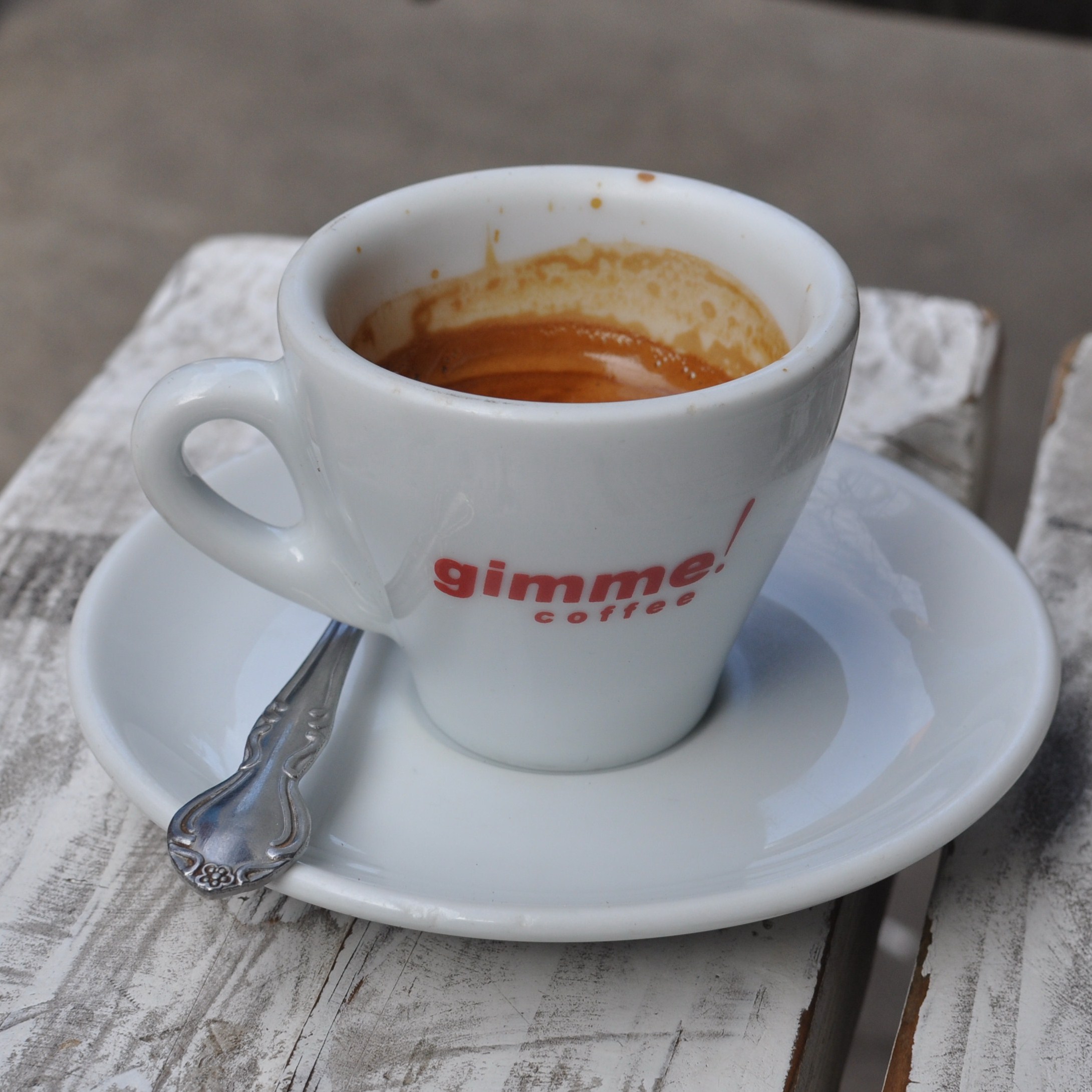 Thumbnail – Gimme! Coffee (DSC_9154) Published May 9, 2013 at 2180 × 2180 in Gimme! Coffee, Mott Street An espresso in a proper gimme! coffee cup, on the bench outside the Mott Street branch.