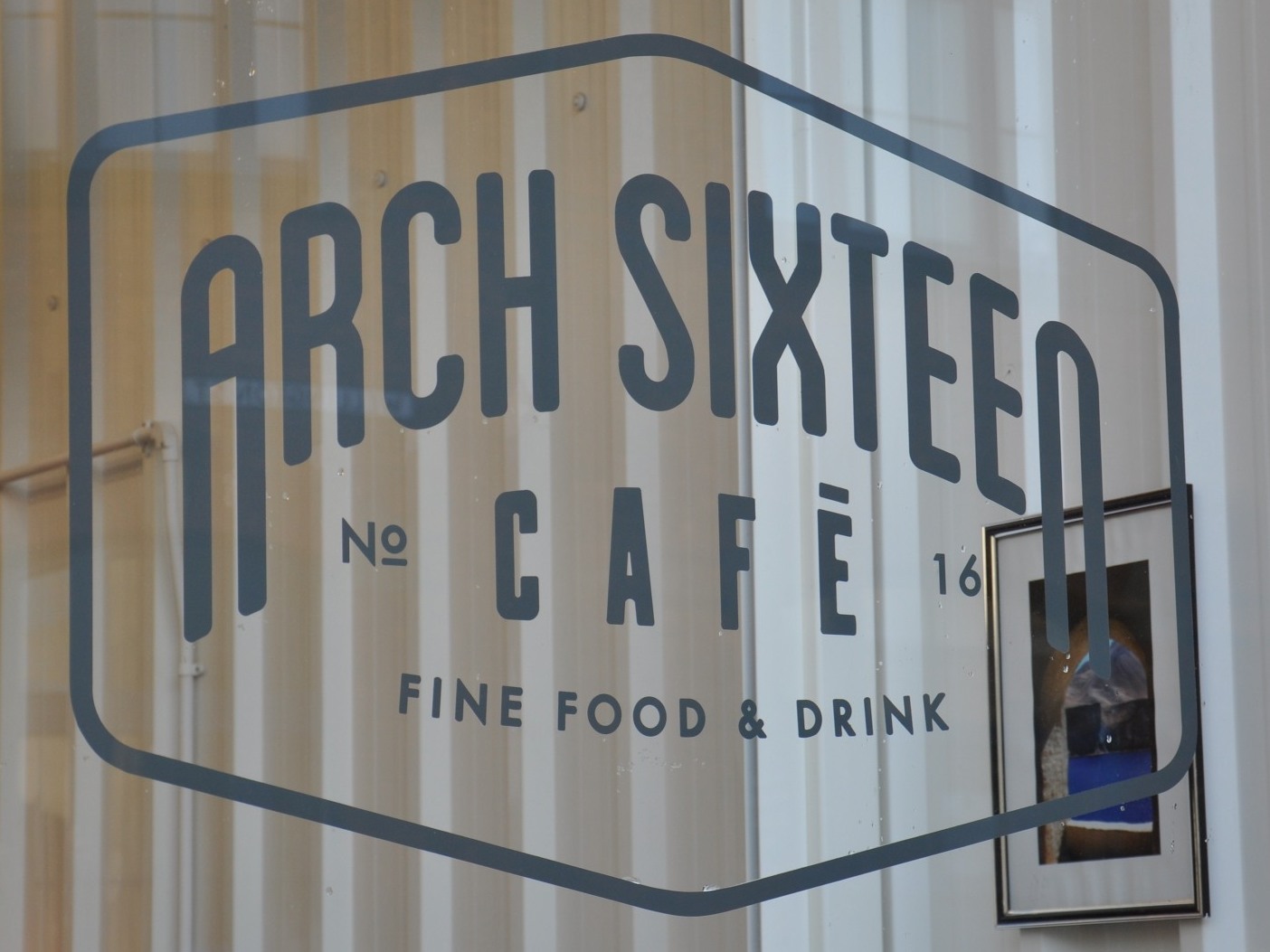 Thumbnail – Arch Sixteen Cafe (DSC_7528) Published November 4, 2013 at 1404 × 1053 in Arch Sixteen Café The Arch Sixteen Logo in the window of Arch Sixteen Cafe: Fine Food & Drink