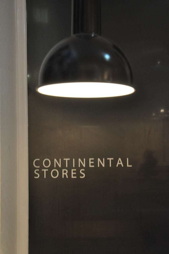 Thumbnail – Continental Stores (DSC_1231) Published February 24, 2014 at 692 × 1042 in Continental Stores One of the Continental Stores black light fittings hanging above the name written in white on a darkened window.