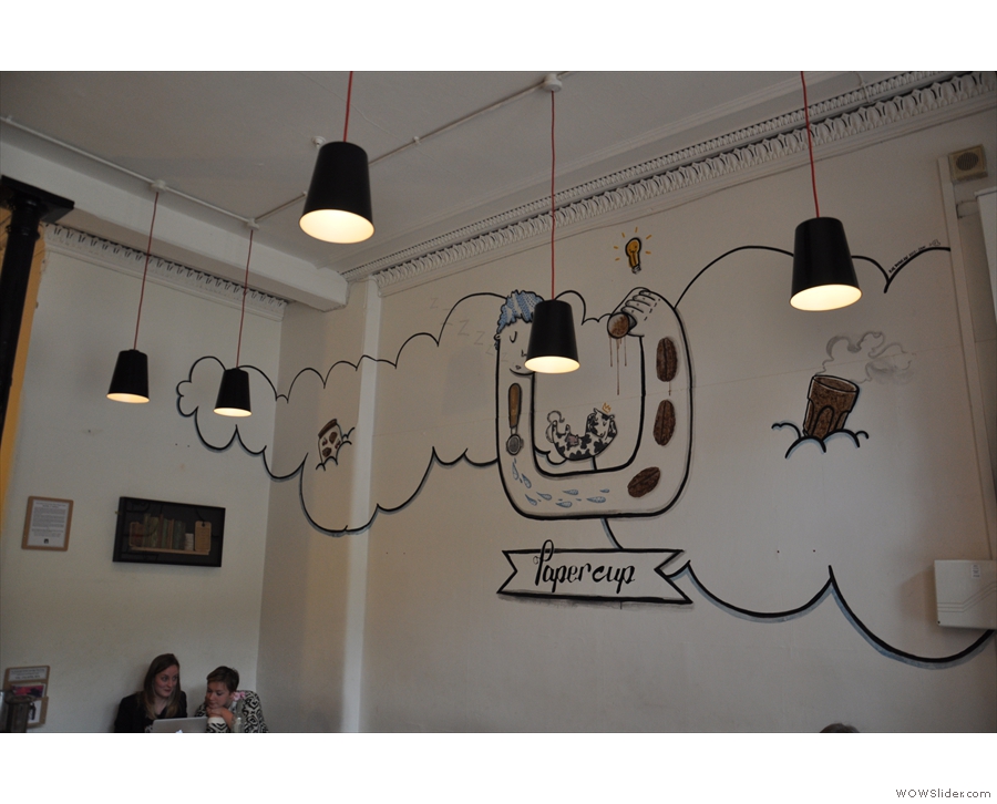 Papercup has an unfinished look: the bare, concrete floor has traces of red paint, while the wall is plastered and patched behind the counter (although it’s neatly tiled in black around the food and coffee preparation areas). Otherwise it’s whitewashed walls and ceiling, with what looks to be original coving and an amazing central rose. For such a long, thin store, it’s very bright inside, with the generous windows supplemented by lots of lights.