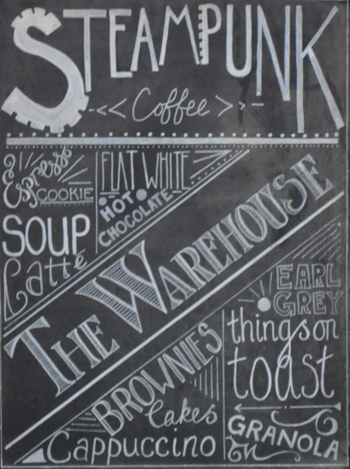 Thumbnail – Steampunk (DSC_6712t) Published December 4, 2014 at 1443 × 1932 in Steampunk, The Warehouse Details from one of Steampunk’s white boards, listing various of its offerings.