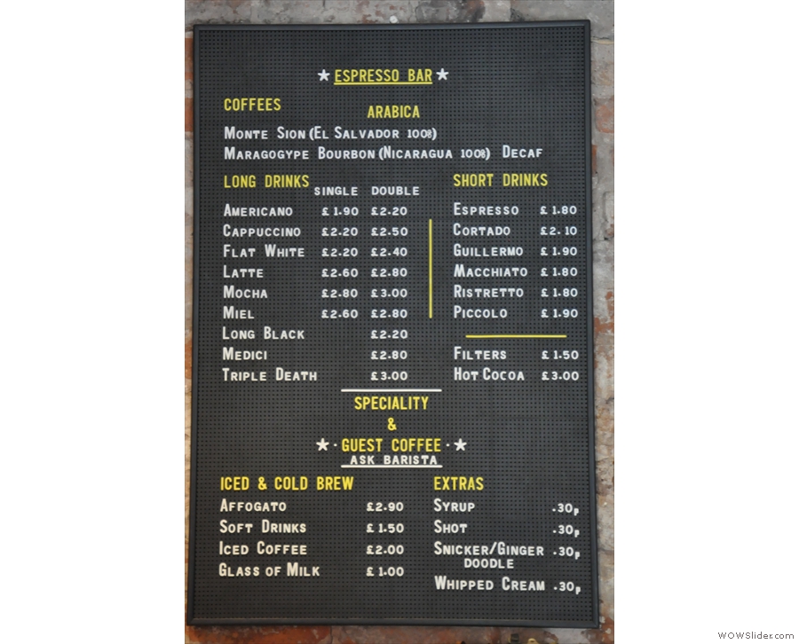 The house-blend is from Coffee 1652, which also supplies the decaf. During my visit, these were an El Salvador Monte Sion and, on decaf, a Nicaraguan Maragogype Borurbon. I asked about the guest bean, which changes every two to three weeks, but no-one had told the two baristas what it was. We discovered it was from Adams + Russell in nearby Birkenhead and that it was really dark, so we all tried it. Of the three of us, I probably enjoyed it the most: very old school, bitter, but not unpleasantly so (although my third-wave friends would probably disown me for saying so). Even so, you’d probably only want a single shot since it has all the subtly of a punch in the mouth.
