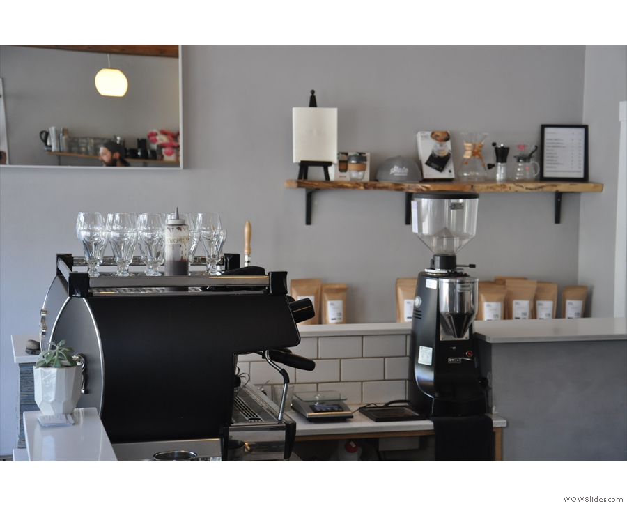 A large part of Slate is given over to the counter, which occupies the back two-thirds of the store on the right-hand side. Effectively an L, on the far right (top of the L), there are three bar-stools, while on the back left (bottom of the L) there are two more. The ones on the right give a birds-eye view of the filter coffee being made, while the ones on the left provide behind-the-scenes access to the espresso machine which is directly opposite the door. There’s a low bench against the left-hand wall, but the majority of the seating is provided by the two window-bars, although you’ll have your back to the counter if you sit here.
