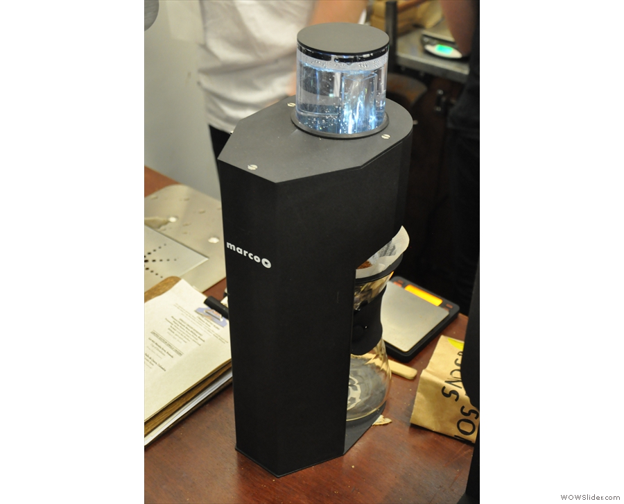 The SP9 was also fairly prolific: I had a run-down of its operation on the Climpson and Sons stand and saw it on several other stands, while Marco itself had a stand. The SP9 comes with its own custom filter and carafe, but can also be used with a variety of other brewing methods. For example, the tower is tall enough to get a Chemex under the brew-head, while a magnetic metal plate allows you to fit a V60, Kalita Wave or most other pour-over filters.