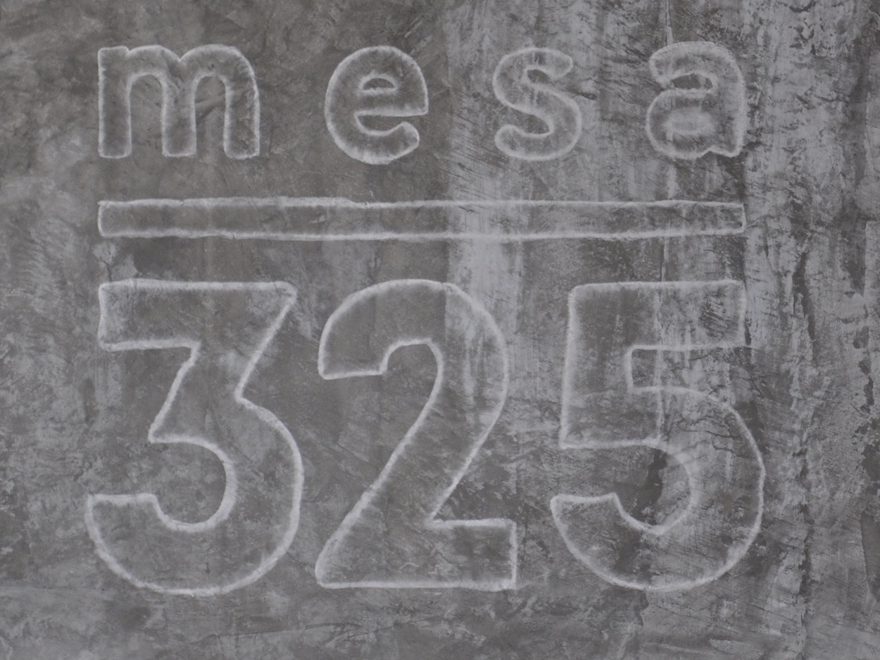 Thumbnail – Mesa 325 (DSC_0563t) Published June 23, 2016 at 1250 × 937 in Mesa 325 Mesa 325, written in white stencil on the grey concrete wall of Mesa 325.