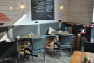 However, the majority of the seating’s to the right, although to get there you have to go up to the counter and around, giving it a secluded feel. There’s an L-shaped, padded bench-seat with a couple of tables here, just to the right of the door, but facing into the seating area. A long window-bar blocks off the second set of doors, while, against the right-hand wall, there are more padded bench-seats. Finally, several tables occupy the space in the middle.