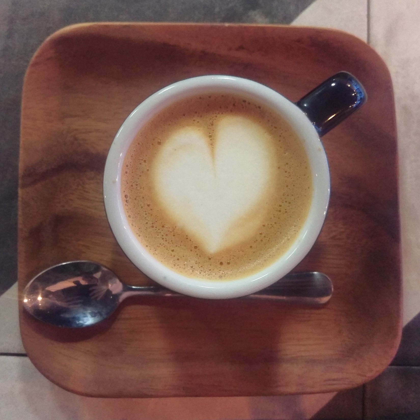 Thumbnail – Frequency Ltd (20160826_083227) Published September 4, 2016 at 1650 × 1650 in Frequency A lovely Workshop flat white from Frequency, served on a wooden tray instead of a saucer.