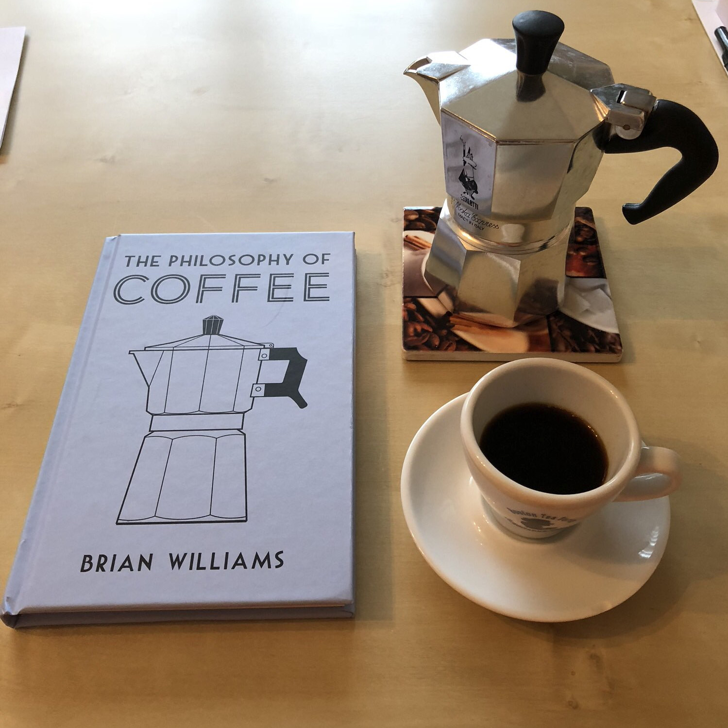 Rob Reeves settles down to read my book, The Philosophy of Coffee over a cup of coffee, brewed with a stove top espresso machine. Picture (c) Rob Reeves and used with permission.