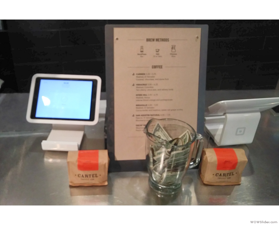Cartel occupies a U-shaped space, with the entrance on the left, where you’ll find retail bags of coffee, along with the more traditional grab-and-go sandwich offerings. You file past here on your way to the till at the back, where you place your order, then you come back on the other side of the U, past first the espresso machine, then the pour-over station. Finally, you end up at the front on the right which is great, since it gives you the perfect view of the pour-over station, plus, if you have good eyesight (or a decent zoom lens on your camera) you can watch the espresso being extracted at the other end of the counter. And, of course, you can chat to the baristas.