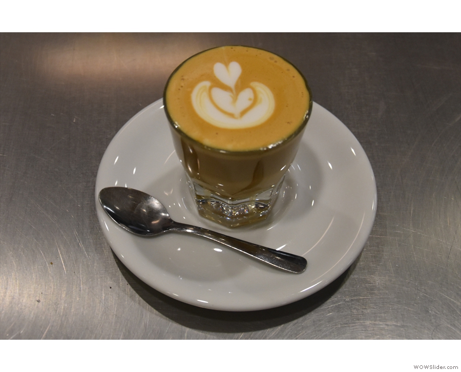When I flew out, however, I left myself plenty of time before my flight to pay Cartel a visit. Since I wanted to sleep on the flight, and had already had plenty of coffee that day, having visited Fourtillfour, Regroup and Cartel in Scottsdale, I ordered a decaf cortado using the Mexico Chiapas beans. Pleasingly, this arrived in a glass, rather than a takeaway cup, another sign of Cartel’s refusal to compromise. This was also lovely, another rich, creamy coffee, with chocolate notes and some impressively-steamed milk which held the pattern all the way to the bottom of the cup, a suitable send-off before my flight.