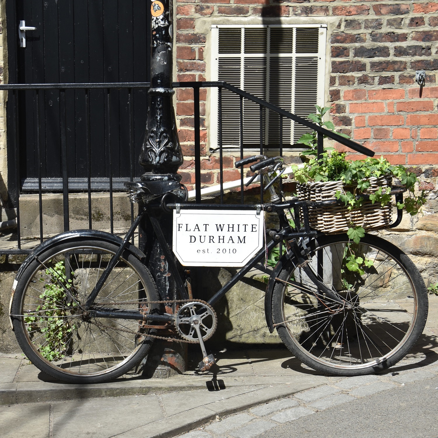Thumbnail – Flat White Cafe (DSC_9713t) Published July 9, 2018 at 1500 × 1500 in Flat White Café A bicycle on the lane leading to Flat White Cafe in Durham, confirming that you’re on the right track.
