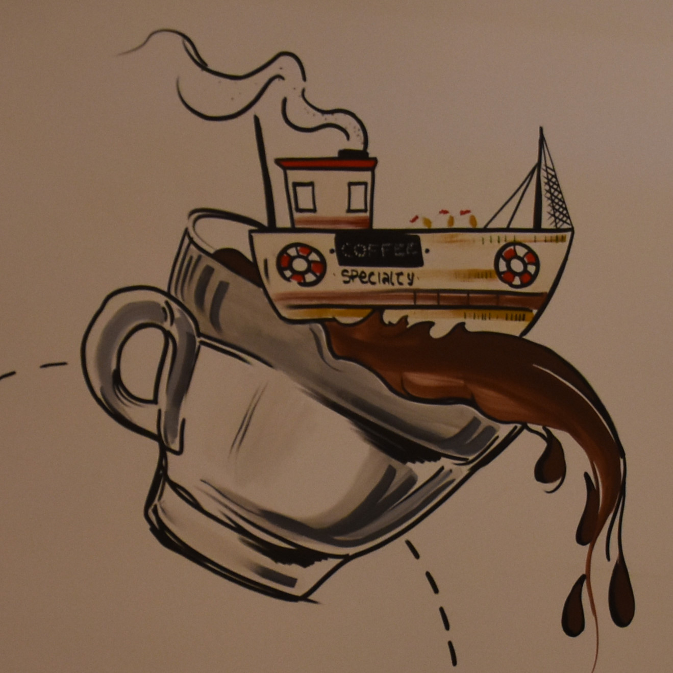 Detail of the wall art in the back room of Faro in Rome, showing part of coffee’s journey from plant to cup. Here the coffee is being shipped from origin.