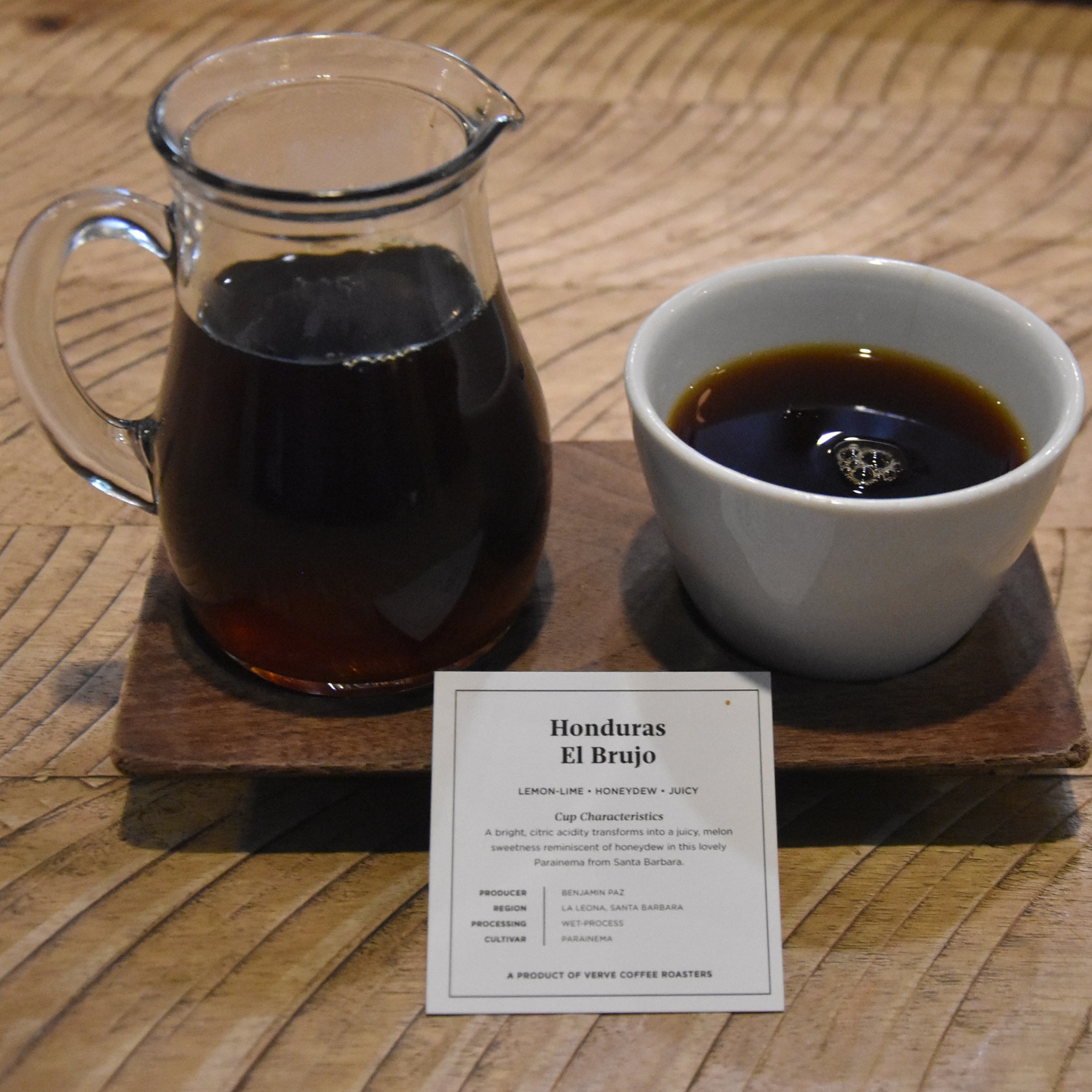 A Honduran single-origin pour-over served at Verve Coffee Roasters on Spring Street, Los Angeles, The coffee comes in a carafe, cup on the side, presented on a wooden tray with a card giving details of the beans.