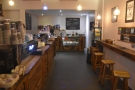 The interior is perhaps three times as deep as it is wide, with the L-shaped counter occupying much of the left-hand side, the short part of the L extending along the back wall. The seating, meanwhile, is at the front, with a narrow, five-person bar along the right-hand wall opposite the counter. To the left, as you enter, is an open area, retail shelves on the left-hand wall, with two stools at the narrow end of the counter. On the right are a pair of back-to-back pews, one facing front, a low coffee table between it and the window. The other faces rearward, sharing a coffee table with a third pew against the right-hand wall. The pews came from an old church, while the rest of the furniture, counter included, is made from upcycled wood.