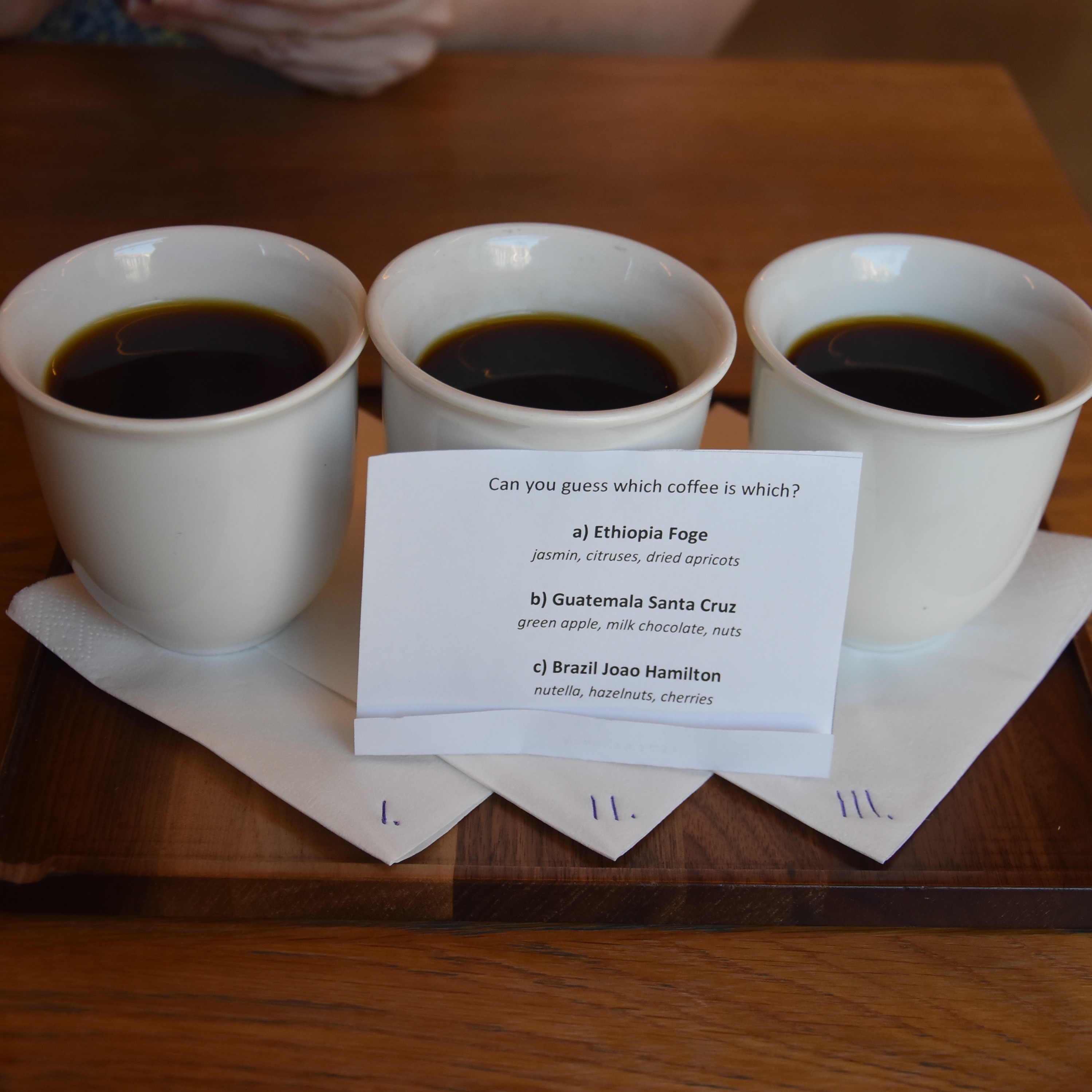 Thumbnail – Dinner at Misto (DSC_5063t) Published December 10, 2019 at 2998 × 2997 in Dinner at Kavárna Místo The coffee tasting flight at Kavárna Místo in Prague.: three different single-origin filters. But can you guess which is which?