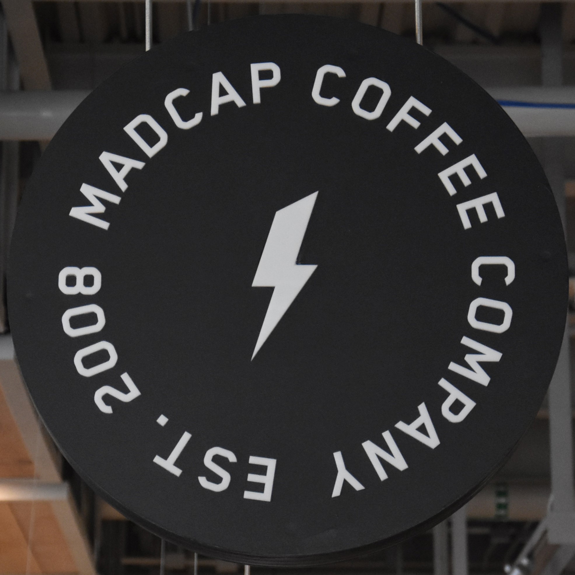 Thumbnail – Madcap, Downtown Market (DSC_9245) Published November 20, 2019 at 1971 × 1971 in Madcap, Downtown Market The Madcap Coffee sign, with its distinctive lightning bolt symbol, hanging from the roof at Grand Rapids’ Downtown Market.