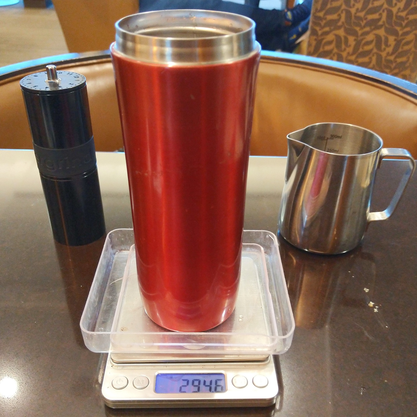 Making airline coffee bearable: make your own! My Espro Travel Press and Knock Aergrind in the American Airlines lounge at San Francisco Airport before my flight to Phoenix.