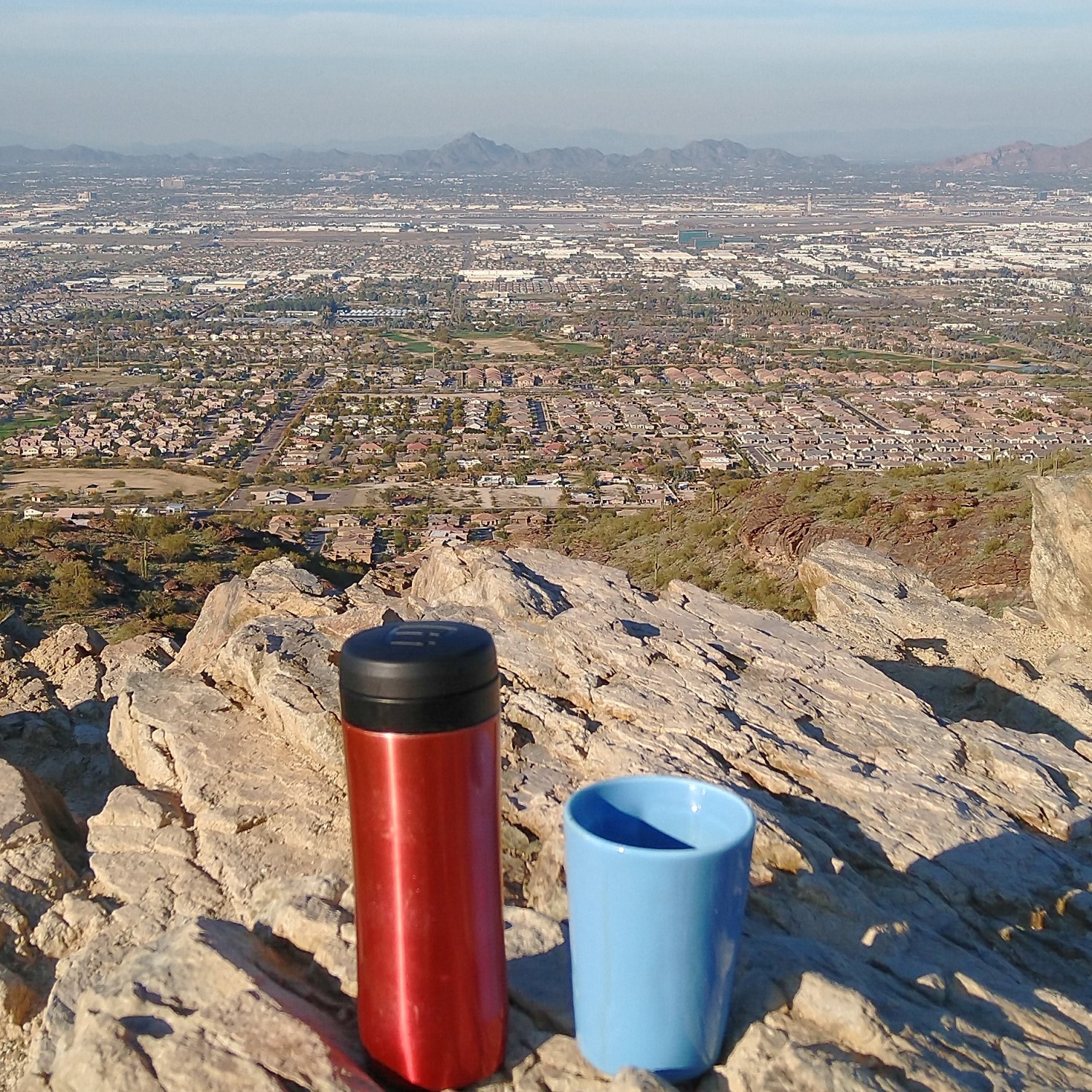 Thumbnail – Travels with my Coffee, USA 2020 (20200117_155136) Published February 15, 2020 at 1500 × 1500 in Travels with my Coffee: USA 2020 My Travel Press and Therma Cup overlook Phoenix from the Ridge Line Trail along South Mountain.