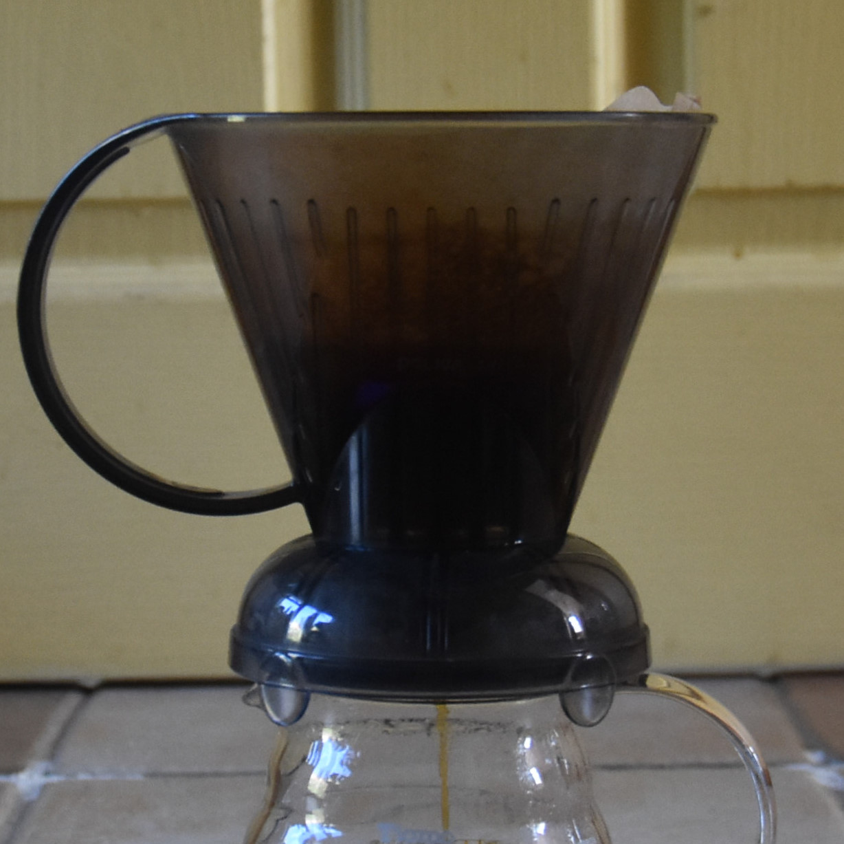 Thumbnail – Clever Dripper (DSC_0091t) Published April 6, 2020 at 1228 × 1227 in Making Coffee at Home: Clever Dripper A Clever Dripper, sitting on top of a glass carafe, the brewed coffee draining through the bottom of the filter.