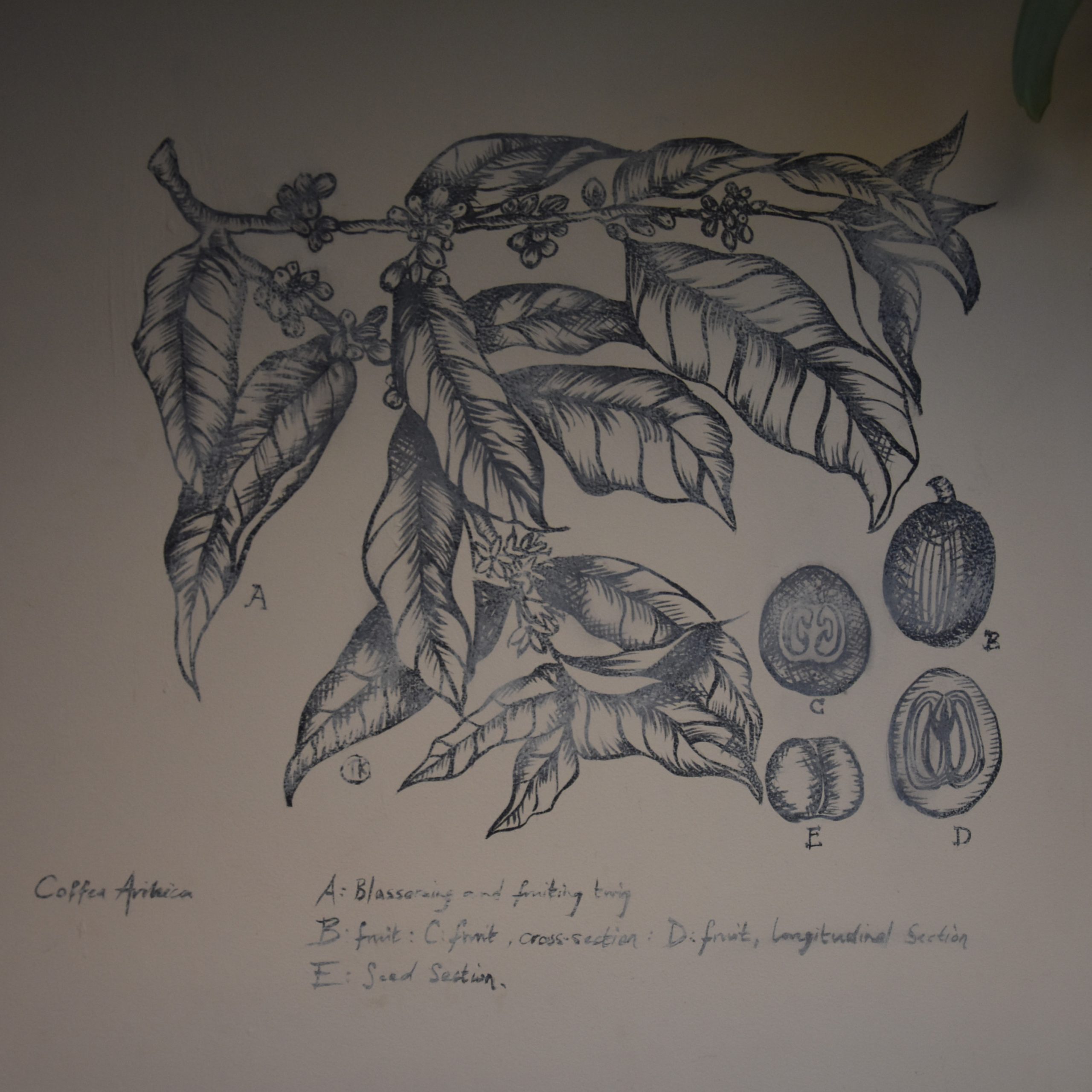 One of the beautiful coffee artworks on the wall of Canopy Coffee in Guildford, showing the branch of a coffee tree and cross-sections of the coffee cherry.