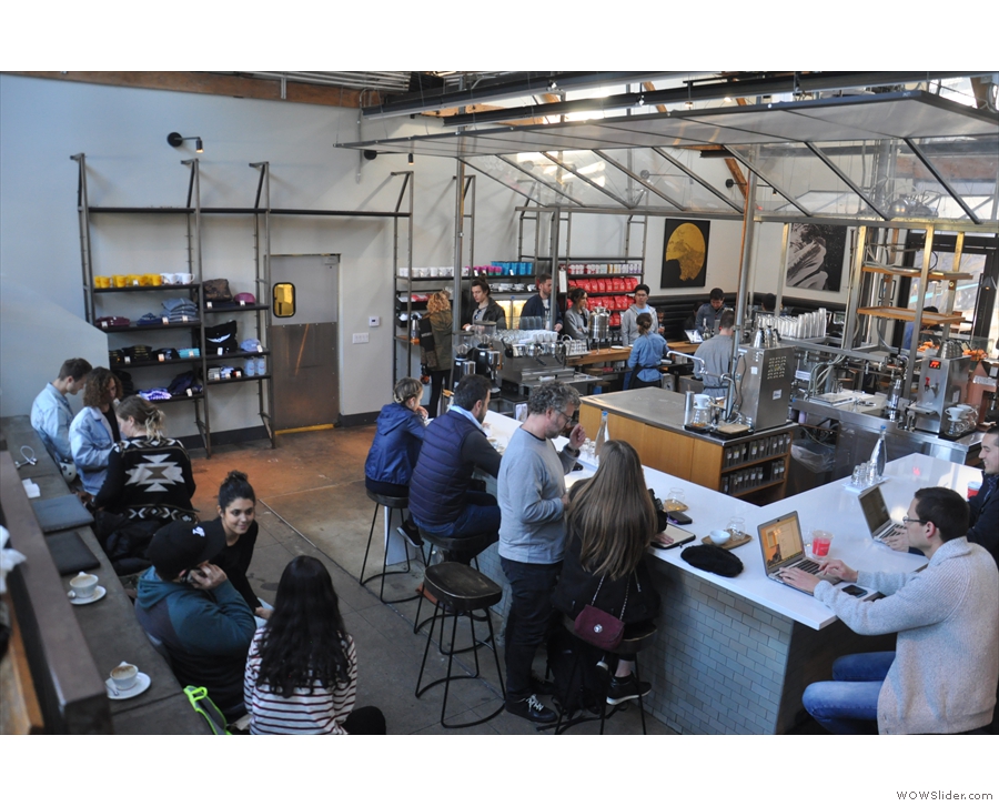 Inside, Intelligentsia has a very industrial feel, the space open all the way to the roof, which soars above you, although there’s a false glass ceiling above the front half of the store, with air-conditioning conduits above that. A very bright space, there are windows front and back, plus skylights in the ceiling.