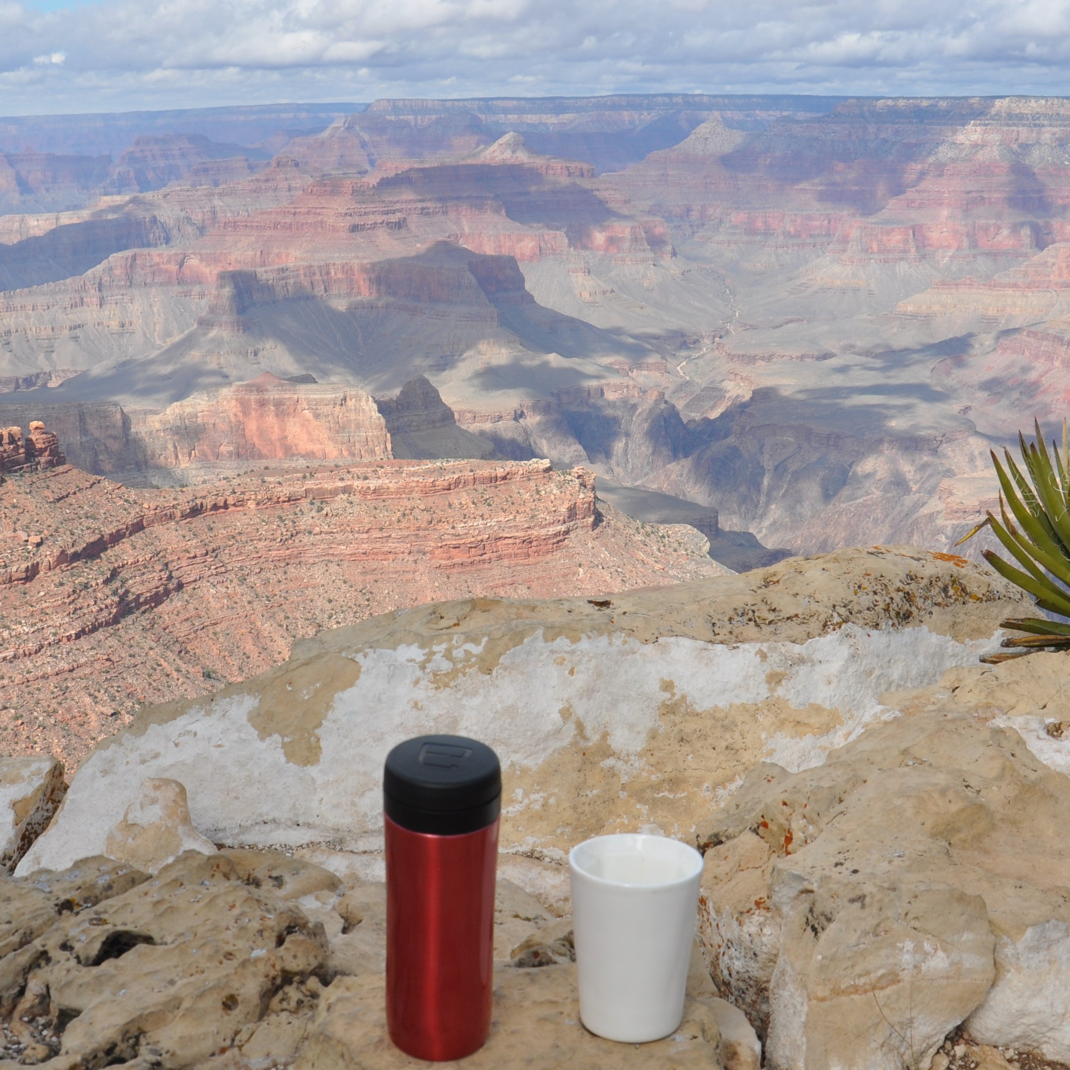 My coffee, in the shape of my Travel Press and Therma Cup, takes in the views from the South Rim of the Grand Canyon near the start of the Trail of Time.