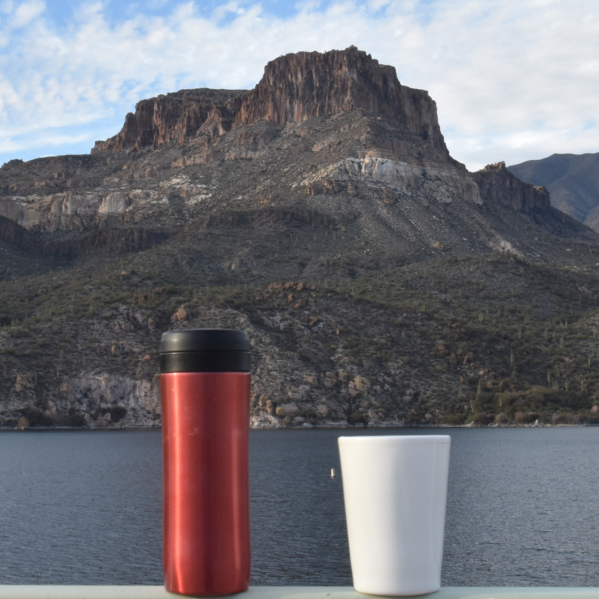 Thumbnail – The Apache Trail, Part III (DSC_8236t) Published April 10, 2021 at 2044 × 2044 in Brian’s Travel Spot: The Apache Trail & Apache Lake My Espro Travel Press and ThermaCup admire the views across Apache Lake on the Apache Trail in Arizona.