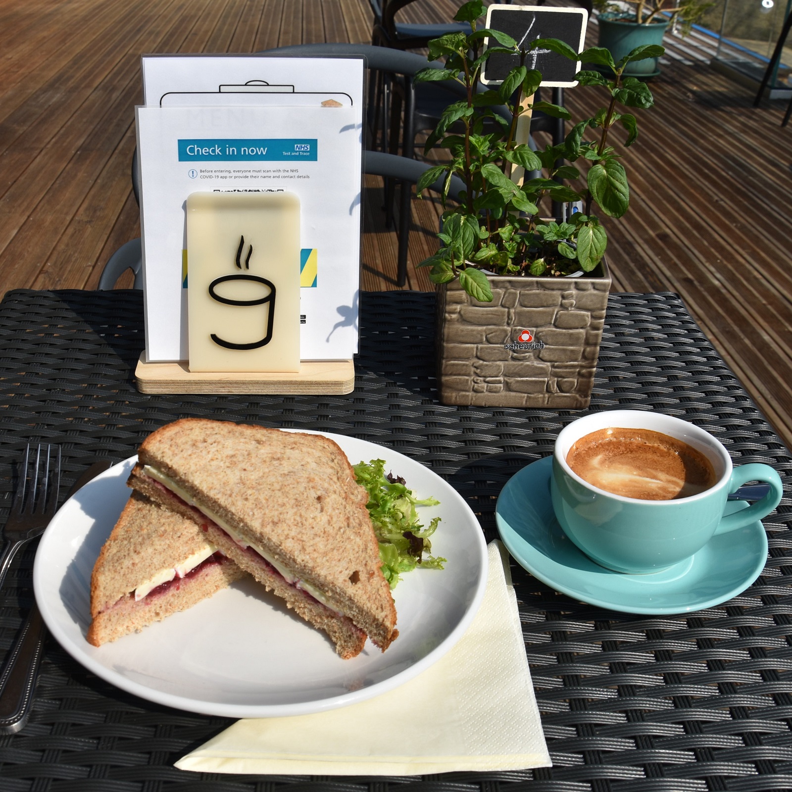 Thumbnail – Open Grounds Cafe (DSC_0710t Published May 6, 2021 at 1600 × 1600 in Open Grounds Café (COVID-19) My brie and cranberry sandwich, along with my flat white, sitting in the sun on the patio at Open Grounds Café.
