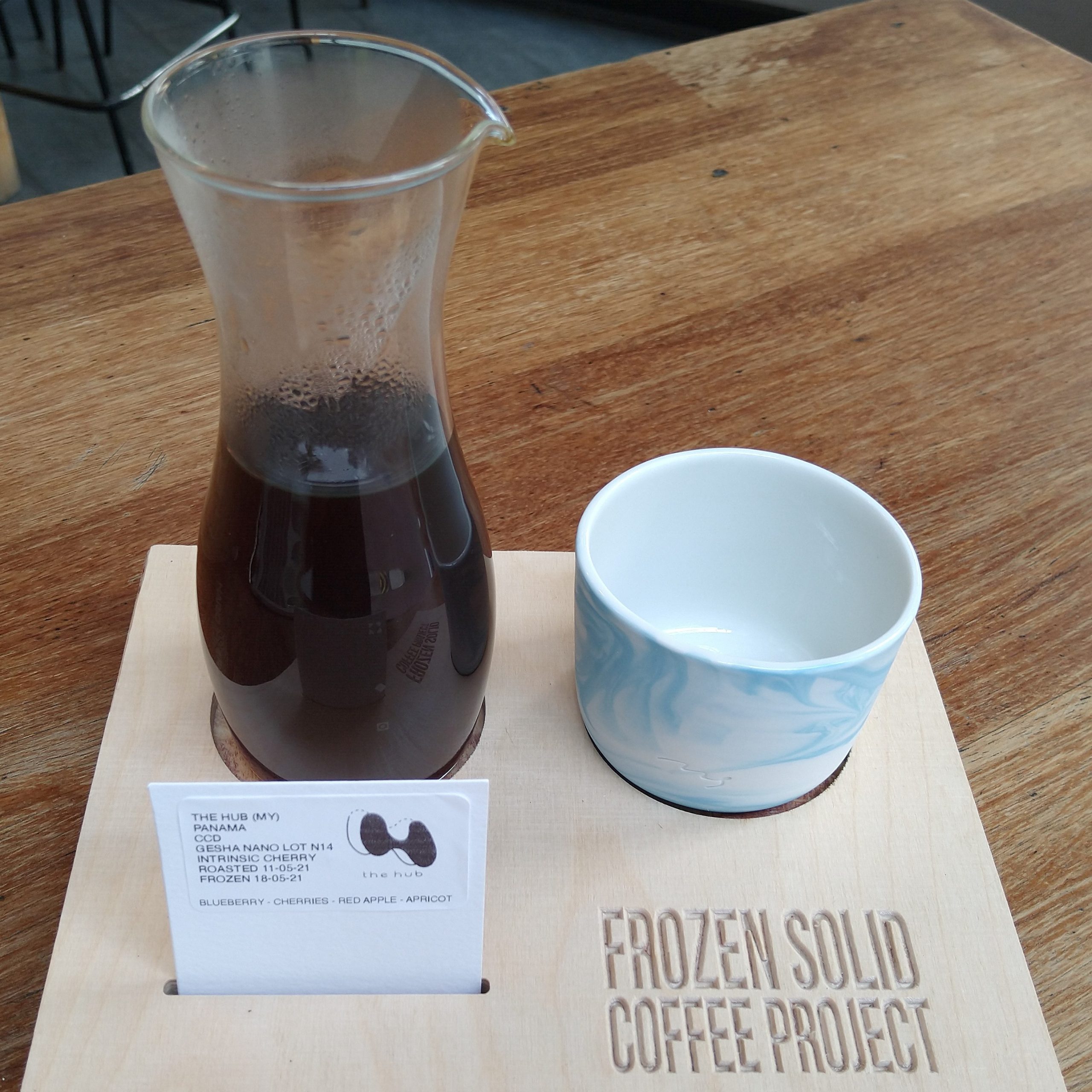 My coffee, the Nano Lot N14, a Gesha grown by Creativa Coffee District in Panama, roasted by The Hub in Malaysia and served in a carafe, with a lovely ceramic cup on the side, all presented on a wooden tray, part of the Frozen Solid Coffee Project at Tilt in Birmingham.