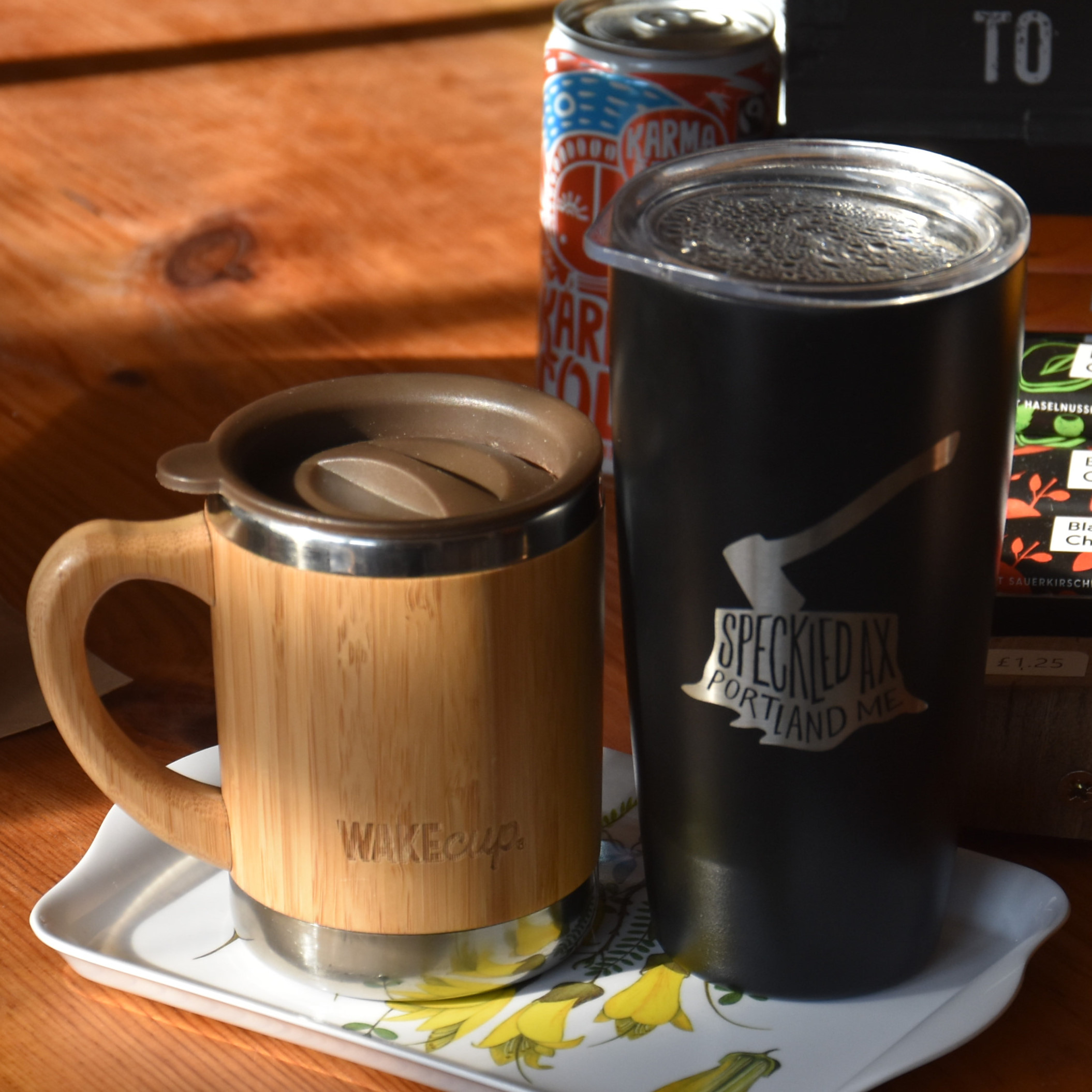 Thumbnail – Rumdoodles (DSC_0596t) Published September 18, 2021 at 2110 × 2110 in Rumdoodles My Global WAKEcup and Amanda’s Speckled Ax reusable cup waiting for their coffee at Rumdoodles in Llanberis.