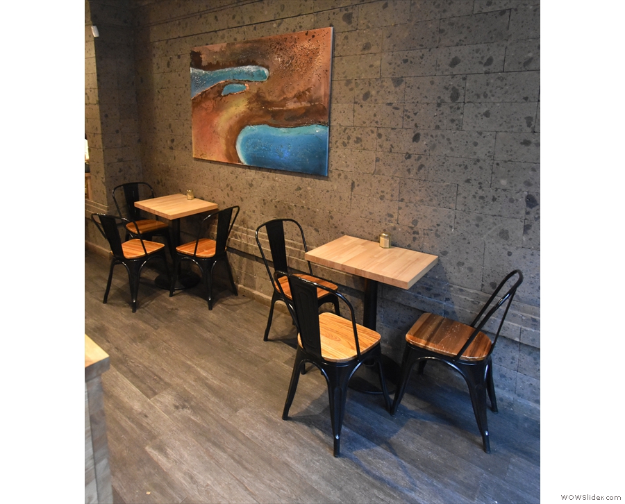 There’s more seating at the back, beyond the counter, starting with three two-person tables lining a bench on the right, in front of a massive mirror which occupies almost the entire wall. There’s one more table, another three-person one this time, which is on the left, tucked away behind the counter.