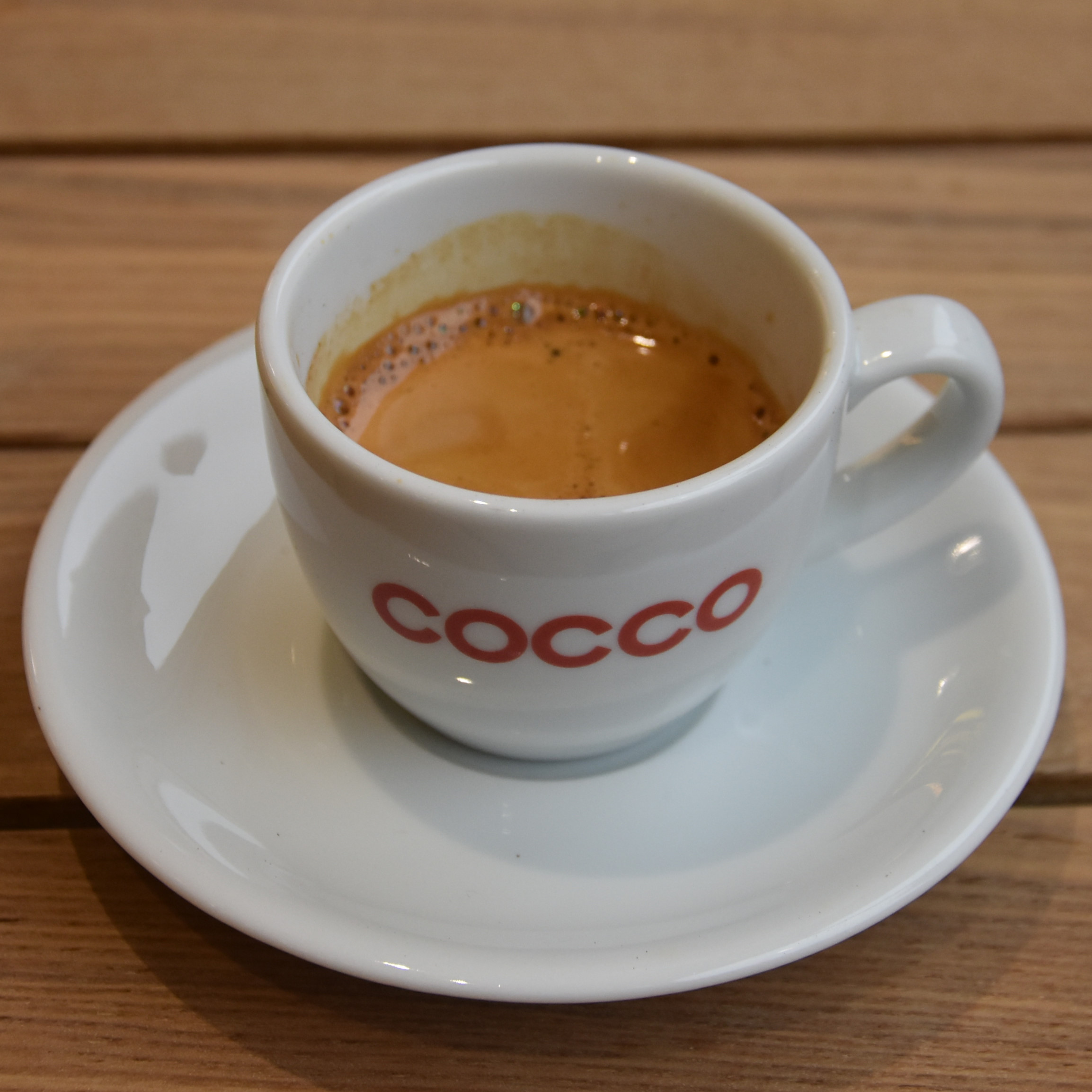 An espresso, made with the Red Brick blend from Square Mile, served in a classic white cup with “Cocco” on the side in red at Cocco Patisserie & Coffee.