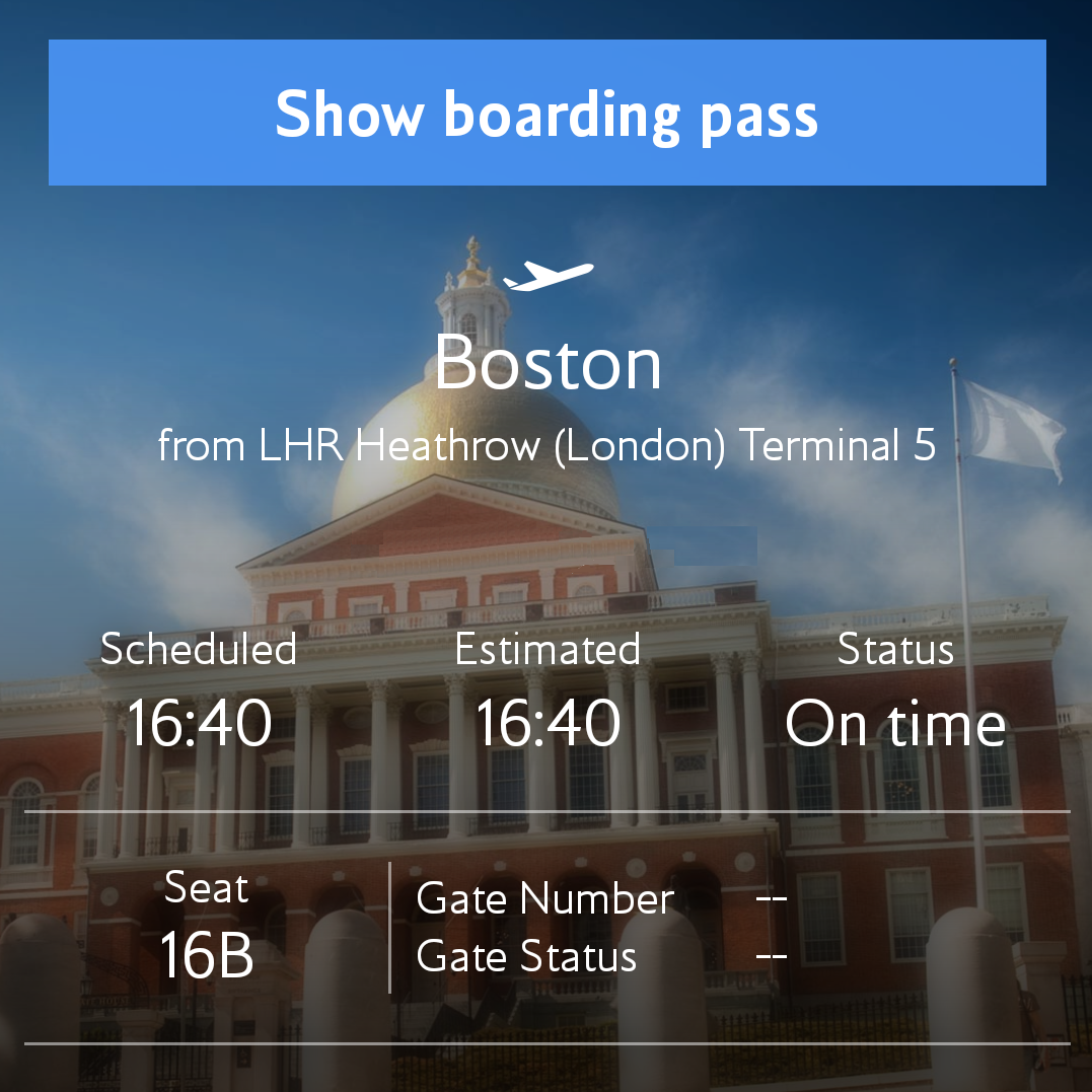 My online boarding pass for my flight to Boston with British Airways, departing at 16:40 from London Heathrow. The bulding in the background is the Massachusetts State House.