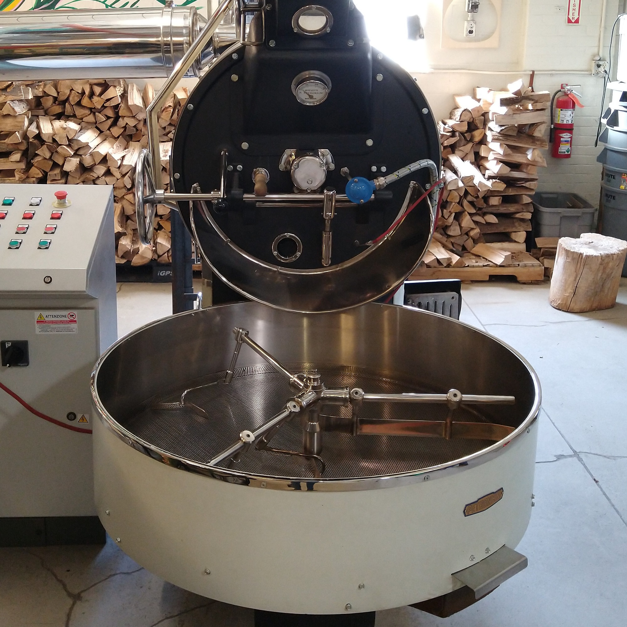 The Speckled Ax roaster, a refurbished 20 kg Petroncini roaster from the 1970s, in the Walton Street roastery, with the tell-tale woodpile against the wall behind it.