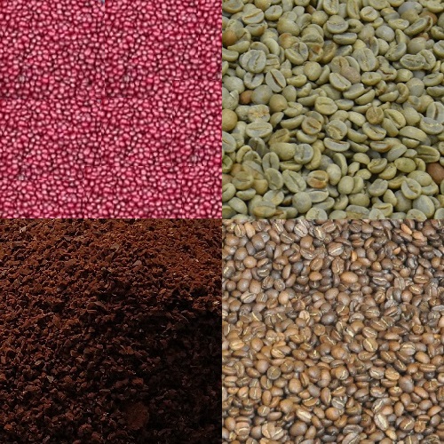 Thumbnail – Real Coffee Published March 26, 2022 at 500 × 500 in What is “Real” Coffee Four stages of coffee, going clockwise from top left: coffee cherries, green beans, roasted beans, ground coffee.