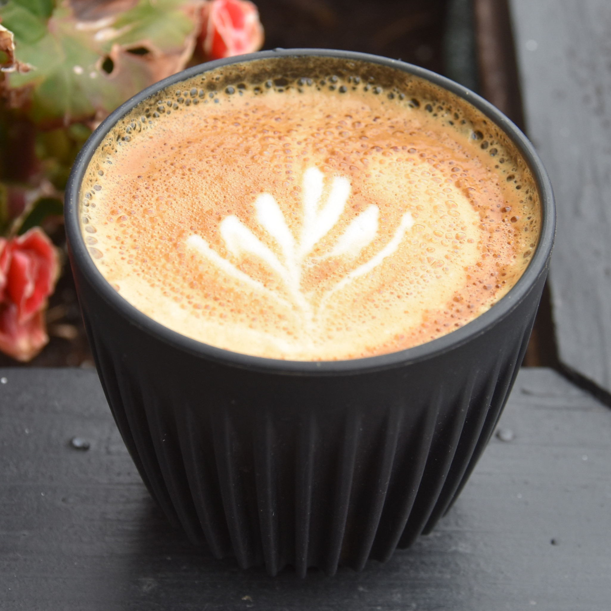 Enjoying a lovely flat white in my HuskeeCup, made with the Red Bank Penny Rock single-origin espresso while sitting outside Blooming Skull Coffee in Bebington.