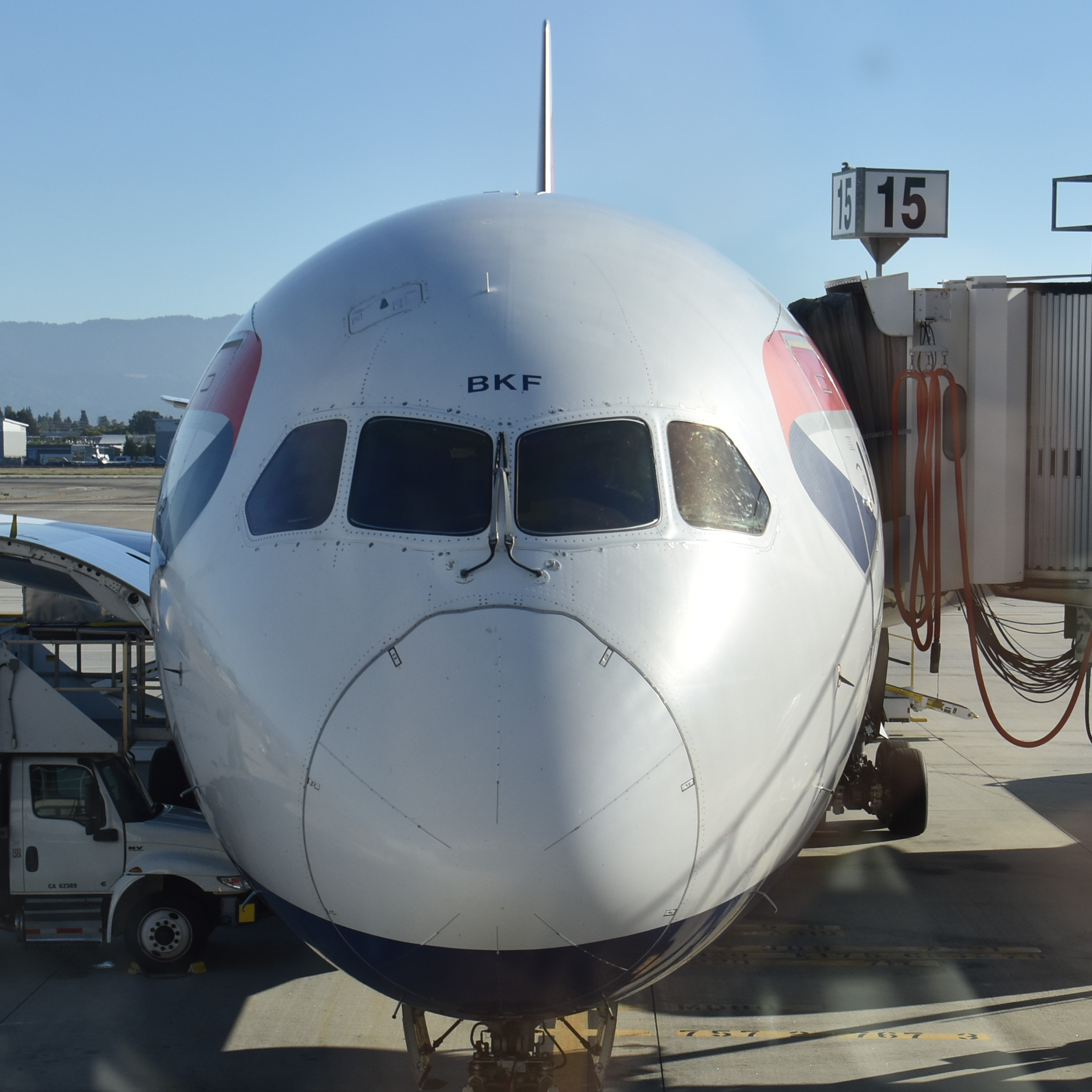 Thumbnail – San Jose in Club World (DSC_0439t) Published August 20, 2022 at 2093 × 2093 in Brian’s Travel Spot: San Jose in Club World A nose-on view of my British Airways Boeing 787-9 on the stand, Gate 15, at San Jose, having flown me in style from London Heathrow.