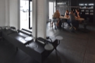 If you want to sit on the left, there’s a central table, long and thin, with eight fixed stools. Alternatively, a short, three-person padded bench runs along the left-hand wall under a neat hidden-word puzzle, followed by a small retail section, featuring bags of beans and coffee equipment. Another three-person padded bench runs along the full length of the dividing wall, continuing on the other side, where it forms a U-shaped seating area along with the front and right-hand walls. Each of the benches features cylindrical, padded back rests and small, in-built round coffee tables.