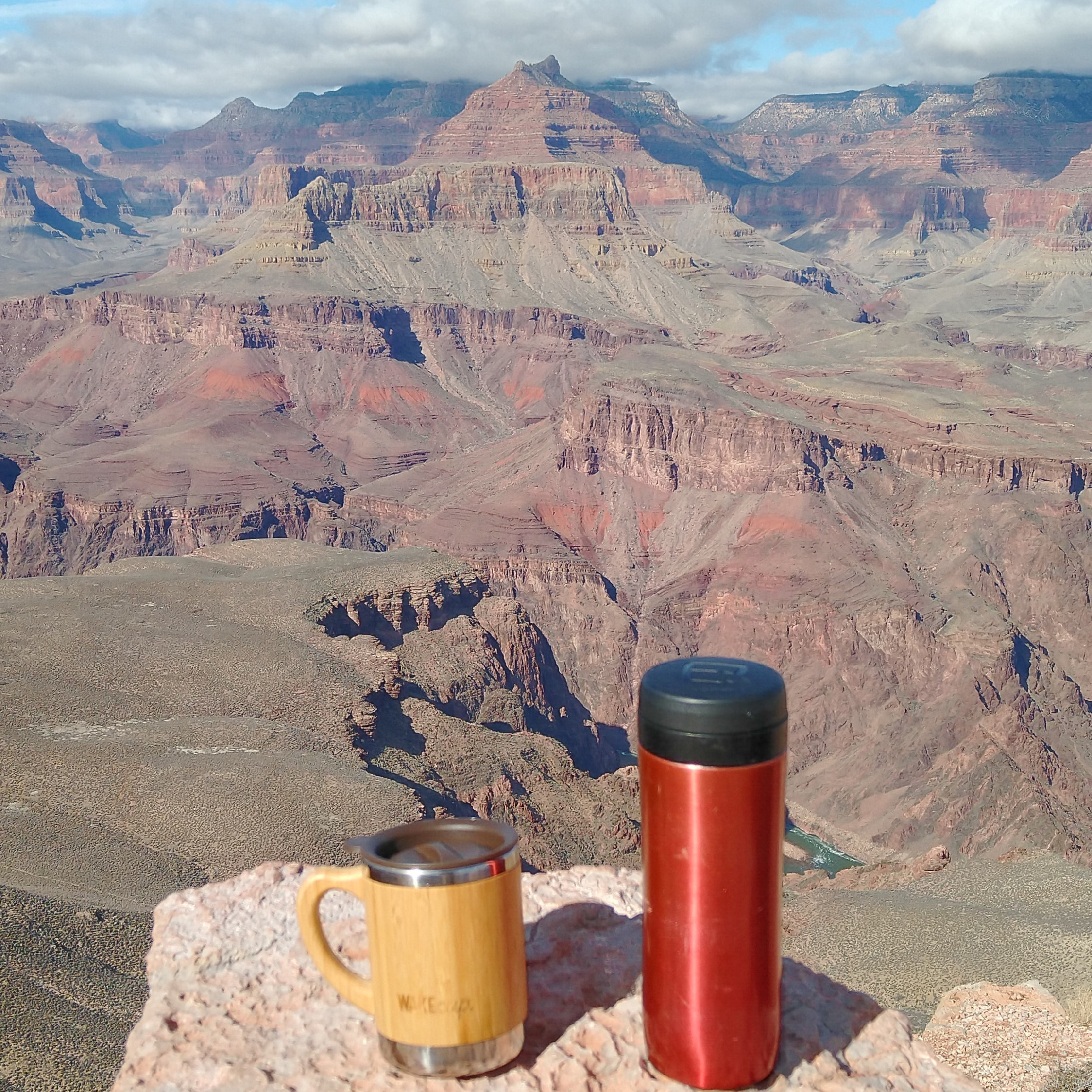 My Global WAKEcup and Travel Press look down into the Grand Canyon from Skeleton Point, the furthest point of my hike along the South Kaibab Trail. Looking to the right of the Travel Press, you can see the Colorado River at the bottom of the Grand Canyon.
