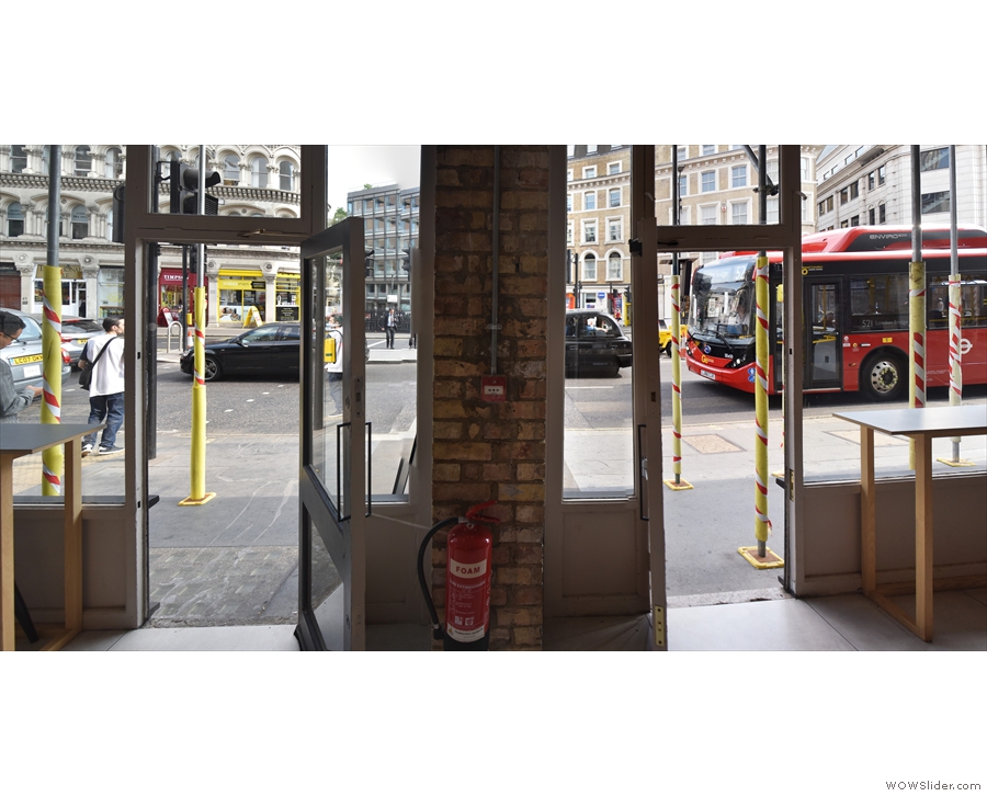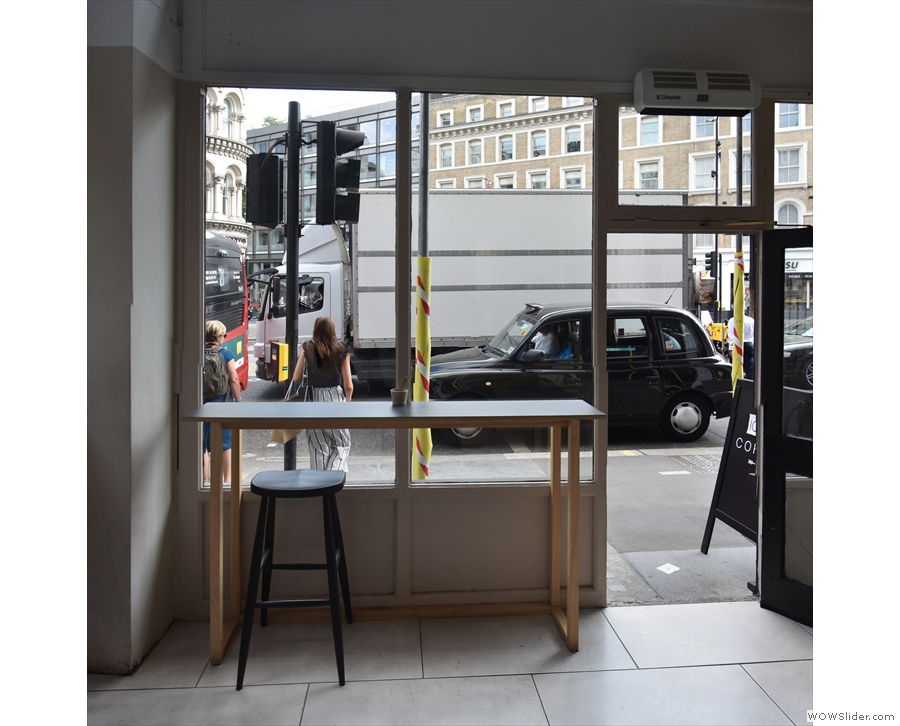 If you’re staying, there’s not much in the way of seating, just wooden, standalone bars. To the right of the first door is a two-person bar with bar stools, with a further four-person bar in the windows at the narrow end of the wedge. Meanwhile, to the left of the second door is another window-bar, standing room only this time, with a fourth bar running all the way along left-hand wall at the thick end of the wedge.